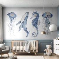 Fototapet Selvklæbende Deluxe Sticker - Havets vidundere - Havdyr, Søhest, Vandmand - 100x70 cm