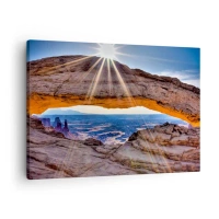 Lærredstryk - Billede på lærred - Klippebue med udsigt over kløften ved solopgang - 70x50cm - Gennem stenporten - Moderne vægdekoration til stue og soveværelse ARTTOR