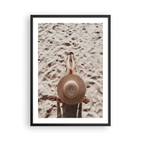 Plakat i sort ramme - Person solbader på stranden, set ovenfra med en stor hat mod sandet - 50x70cm - En drømmes tid - Moderne vægdekoration til stue og soveværelse ARTTOR