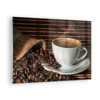 Billede på glas - En kop kaffe med bønner på en rustik baggrund - 70x50cm - Kulets sorthed, ravets gennemsigtighed - Moderne vægdekoration til stue og soveværelse ARTTOR