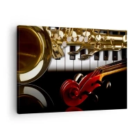 Lærredstryk - Billede på lærred - En gylden saxofon, klavertangenter og en rød violin - 70x50cm - Metalplader, træ og elfenben - Moderne vægdekoration til stue og soveværelse ARTTOR