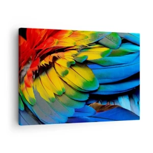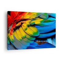Lærredstryk - Billede på lærred - Et nærbillede af en papegøjes farverige fjer - 70x50cm - Paradisfugl - Moderne vægdekoration til stue og soveværelse ARTTOR