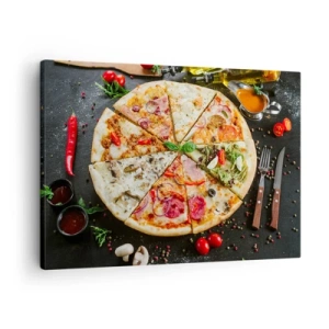 Lærredstryk - Billede på lærred - Pizza i forskellige smagsvarianter med en baggrund af toppings - 70x50cm - Et udvalg af smagsvarianter - Moderne vægdekoration til stue og soveværelse ARTTOR