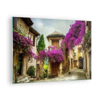 Billede på glas - En malerisk gade med potteblomster - 70x50cm - I en strøm af blomster - Moderne vægdekoration til stue og soveværelse ARTTOR