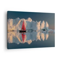 Lærredstryk - Billede på lærred - En sejlbåd med et rødt sejl mod en gletsjers baggrund - 70x50cm - På kanten af verden - Moderne vægdekoration til stue og soveværelse ARTTOR