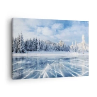 Lærredstryk - Billede på lærred - En frossen sø omgivet af en snedækket skov - 70x50cm - En blændende og krystalklar udsigt - Moderne vægdekoration til stue og soveværelse ARTTOR