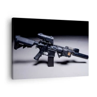 Lærredstryk - Billede på lærred - En moderne riffel i sort på en mørk baggrund - 70x50cm - Den mørke ridder - Moderne vægdekoration til stue og soveværelse ARTTOR