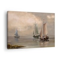 Lærredstryk - Billede på lærred - Sejlbåde på et roligt hav i pastelfarvede omgivelser - 70x50cm - Sømændenes tilbagevenden - Moderne vægdekoration til stue og soveværelse ARTTOR