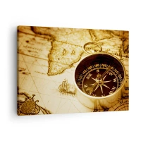 Lærredstryk - Billede på lærred - Et antikt kompas mod baggrunden af et gammelt verdenskort - 70x50cm - Øst eller vest? - Moderne vægdekoration til stue og soveværelse ARTTOR