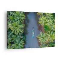 Lærredstryk - Billede på lærred - Fugleperspektiv af en båd på en flod omgivet af palmer - 70x50cm - På en tropisk sti - Moderne vægdekoration til stue og soveværelse ARTTOR