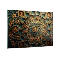 Billede på glas - Guld- og turkis ornament i stil med en arabisk mosaik - 70x50cm - I et arabisk klima - Moderne vægdekoration til stue og soveværelse ARTTOR