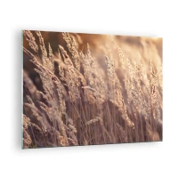 Billede på glas - Gyldne græsser oplyst af den nedgående sols stråler - 70x50cm - Klar til at byde efteråret velkommen - Moderne vægdekoration til stue og soveværelse ARTTOR
