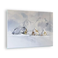 Billede på glas - Vinterlandskab med et sommerhus og høstakke i bjergene - 70x50cm - I en sneklædt dal - Moderne vægdekoration til stue og soveværelse ARTTOR