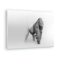 Billede på glas - Sort-hvidt portræt af en majestætisk gorilla mod en hvid baggrund - 70x50cm - Selvsikker på sin styrke - Moderne vægdekoration til stue og soveværelse ARTTOR