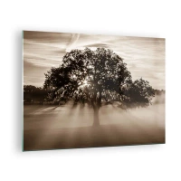 Billede på glas - Et træ i morgentågen med solstråler, der skinner gennem grenene - 70x50cm - Det gode videnstræ - Moderne vægdekoration til stue og soveværelse ARTTOR