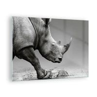 Billede på glas - Et næsehorn i bevægelse mod en grå baggrund - 70x50cm - En ustoppeli - Moderne vægdekoration til stue og soveværelse ARTTOR