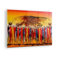 Billede på glas - En farverig scene med mennesker i traditionelle afrikanske kostumer - 70x50cm - Der, der, der, der går de - Moderne vægdekoration til stue og soveværelse ARTTOR