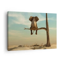 Lærredstryk - Billede på lærred - En elefant sidder på en gren med udsigt over et ørkenlandskab - 70x50cm - Et nyt synspunkt - Moderne vægdekoration til stue og soveværelse ARTTOR