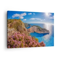 Lærredstryk - Billede på lærred - En klippe med blomster, et turkisblåt hav og et solrigt græsk landskab - 70x50cm - Min store græske ferie - Moderne vægdekoration til stue og soveværelse ARTTOR