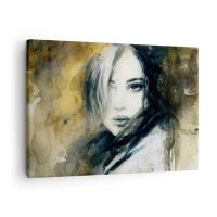 Lærredstryk - Billede på lærred - Portræt af en kvinde mod en baggrund af abstrakte pletter i beige nuancer - 70x50cm - mere uskyldig eller sensuel? - Moderne vægdekoration til stue og soveværelse ARTTOR