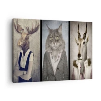 Lærredstryk - Billede på lærred - Triptykon med dyrefigurer i elegant tøj mod en stiliseret baggrund - 70x50cm - Pelse er igen på mode - Moderne vægdekoration til stue og soveværelse ARTTOR