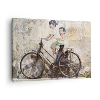 Lærredstryk - Billede på lærred - Gadekunst med en cykel og børnetegninger på væggen - 70x50cm - Sandt eller falsk? - Moderne vægdekoration til stue og soveværelse ARTTOR
