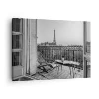 Lærredstryk - Billede på lærred - Udsigt over Eiffeltårnet fra balkonen med liggestole og et bord - 70x50cm - Eftermiddag i Paris - Moderne vægdekoration til stue og soveværelse ARTTOR
