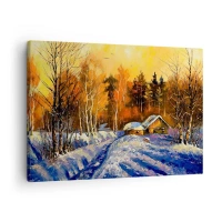 Lærredstryk - Billede på lærred - Vinterlandskab med et hus i lyset af den nedgående sol - 70x50cm - Vinterindtryk i solen - Moderne vægdekoration til stue og soveværelse ARTTOR