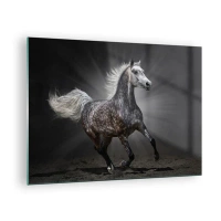Billede på glas - En galoperende hest mod en mørk baggrund med en lyseffekt. - 70x50cm - Gråt er smukt - Moderne vægdekoration til stue og soveværelse ARTTOR