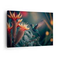 Lærredstryk - Billede på lærred - En farverig kolibri ved blomster mod en naturlig baggrund - 70x50cm - Et virkelig farverigt liv - Moderne vægdekoration til stue og soveværelse ARTTOR
