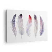Lærredstryk - Billede på lærred - Fem fine fjer i pastelfarver på en lys baggrund - 70x50cm - Delikat som en flerfarvet tåge - Moderne vægdekoration til stue og soveværelse ARTTOR