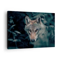 Lærredstryk - Billede på lærred - En ulv i sine naturlige omgivelser, der kigger ud fra skovens dyb. - 70x50cm - Jæger - Moderne vægdekoration til stue og soveværelse ARTTOR