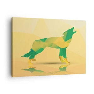 Lærredstryk - Billede på lærred - Geometrisk ulvesilhuet i grønne og gule nuancer - 70x50cm - Ensom ulv - Moderne vægdekoration til stue og soveværelse ARTTOR
