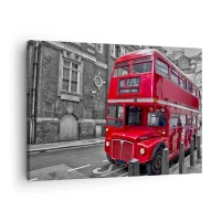 Lærredstryk - Billede på lærred - En rød dobbeltdækkerbus i London mod en baggrund af klassisk arkitektur - 70x50cm - Altid det samme - Moderne vægdekoration til stue og soveværelse ARTTOR
