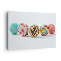 Lærredstryk - Billede på lærred - Farverige praliner med dekorationer på en hvid baggrund - 70x50cm - Livet kan være sødt - Moderne vægdekoration til stue og soveværelse ARTTOR