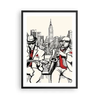 Plakat i sort ramme - To jazzmusikere mod byens skyline som baggrund - 50x70cm - New York improvisation - Moderne vægdekoration til stue og soveværelse ARTTOR