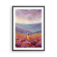 Plakat i sort ramme - En lavendelmark med en kvinde iført hat mod en bjergbaggrund. - 50x70cm - I en verden af lavendel - Moderne vægdekoration til stue og soveværelse ARTTOR