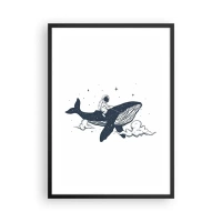 Plakat i sort ramme - Et akvarelluftskib svæver blandt stjerner og skyer. - 50x70cm - Et luftskib - Moderne vægdekoration til stue og soveværelse ARTTOR