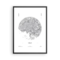 Plakat i sort ramme - Et minimalistisk sort-hvidt kort over Oslo - 50x70cm - Anatomi af Oslo - Moderne vægdekoration til stue og soveværelse ARTTOR