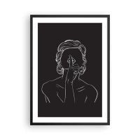 Plakat i sort ramme - En minimalistisk illustration af en kvinde, der laver en stilhedsgestus mod en sort baggrund. - 50x70cm - Skønhed blomstrer i stilhed - Moderne vægdekoration til stue og soveværelse ARTTOR