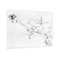 Billede på glas - En fugl siddende på en gren i et monokromatisk vintermotiv. - 70x50cm - Vintermorgen - Moderne vægdekoration til stue og soveværelse ARTTOR