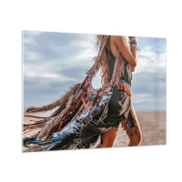 Billede på glas - Kvinde i boho-stil med fjer og dekorationer mod en ørkenbaggrund - 70x50cm - Shamanens pige - Moderne vægdekoration til stue og soveværelse ARTTOR