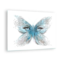 Billede på glas - En sommerfugl med blå vinger og menneskeøjne i en kunstnerisk stil. - 70x50cm - Eros bedemantis - Moderne vægdekoration til stue og soveværelse ARTTOR