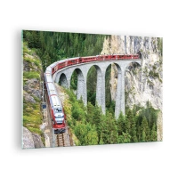 Billede på glas - Et damplokomotiv på en bro i bjergene - 70x50cm - Og hvorhen? Hvorhen? - Moderne vægdekoration til stue og soveværelse ARTTOR