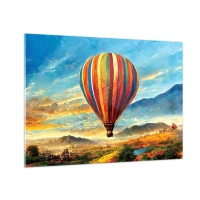 Billede på glas - En farverig ballon, der svæver over et bjerglandskab - 70x50cm - I stilhed kan du se mere - Moderne vægdekoration til stue og soveværelse ARTTOR
