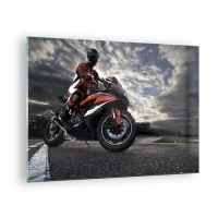 Billede på glas - En motorcyklist på en racerbane under en stormfuld himmel - 70x50cm - Mørkets rytter - Moderne vægdekoration til stue og soveværelse ARTTOR