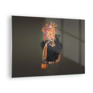 Billede på glas - Figur af en kvinde i sort med et græskar, en kat og et blomsterarrangement - 70x50cm - Heksens fortryllelse - Moderne vægdekoration til stue og soveværelse ARTTOR