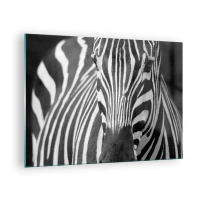 Billede på glas - Sort-hvidt portræt af en zebra med synlige striber - 70x50cm - Verden er sort og hvid - Moderne vægdekoration til stue og soveværelse ARTTOR