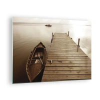 Billede på glas - En båd ved en mole på en rolig sø i sepia - 70x50cm - Stor fred - Moderne vægdekoration til stue og soveværelse ARTTOR