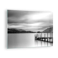 Billede på glas - Sort-hvidt landskab med en sø og en træmole - 70x50cm - Mildhed og styrke - Moderne vægdekoration til stue og soveværelse ARTTOR